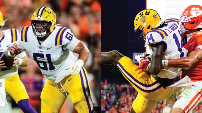 LSU starters - center Braelin Moore (left) and tight end Trey'Dez Green - left Saturday's game with injuries. (LSU photos).