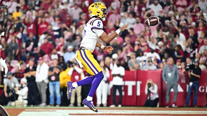 LSU quarterback Jayden Daniels (5) flips the ball to the referee following his 9-yard TD score that tied Saturday's game at 14-14 with Alabama. PHOTO BY: LSU athletics