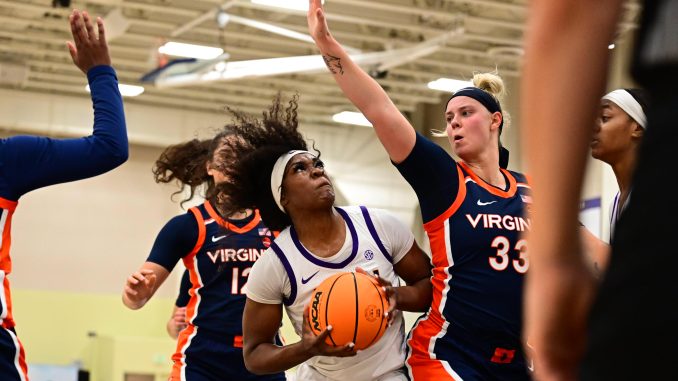LSU built a 10-point lead (57-47) halfway through the final quarter when Virginia (4-2) responded, forcing LSU to turn the ball over against full-court pressure, narrowing the Tigers’ lead to two points with a minute left.