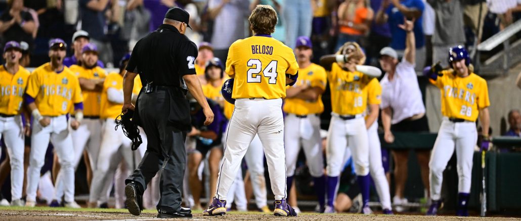 LSU Cade Beloso bellied and hit a monster home run in the top of the 11th and LSU finished off Florida in the bottom half of the inning for a 4-3 win in Game One and moved to one win away from its seventh national title. Photo by LSU Athletics