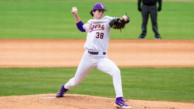 Luke Holman allowed no runs in his debut for No. 2 LSU baseball, a 2-0 win over Central Arkansas. PHOTO BY: Michael Bacigalupi