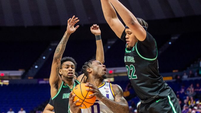 Trae Hannibal was LSU’s top scorer at halftime with nine points. Wright had seven points and Will Baker had just two. Rubin Jones led the Mean Green with 12 points and two threes at the break.