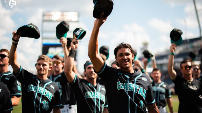 The Chanticleers lead the nation in a very useful category – hit by pitches with an NCAA record 176. In the win over Louisville Wednesday, Coastal took four for the team to break the record of 175 set by UC-Irvine last season.