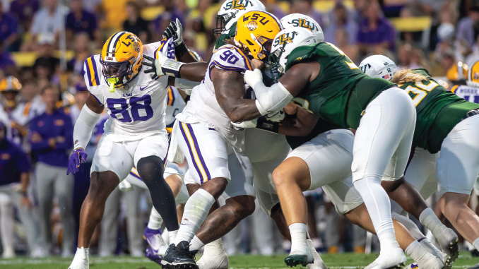 LSU fell from No. 3 to No. 4 in the Associated Press college football poll on Sunday after beating lower level Football Championship Subdivision school Southeastern, 56-10, on Saturday night at Tiger Stadium. (Tiger Rag photo by Michael Bacigalupi).