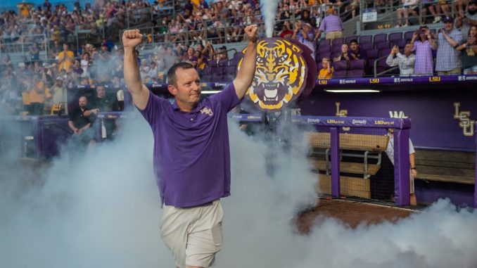 LSU coach Jay Johnson is introduced during national championship celebration at a packed Alex Box Stadium on Wednesday night. (Photo by Michael Bacigalupi).