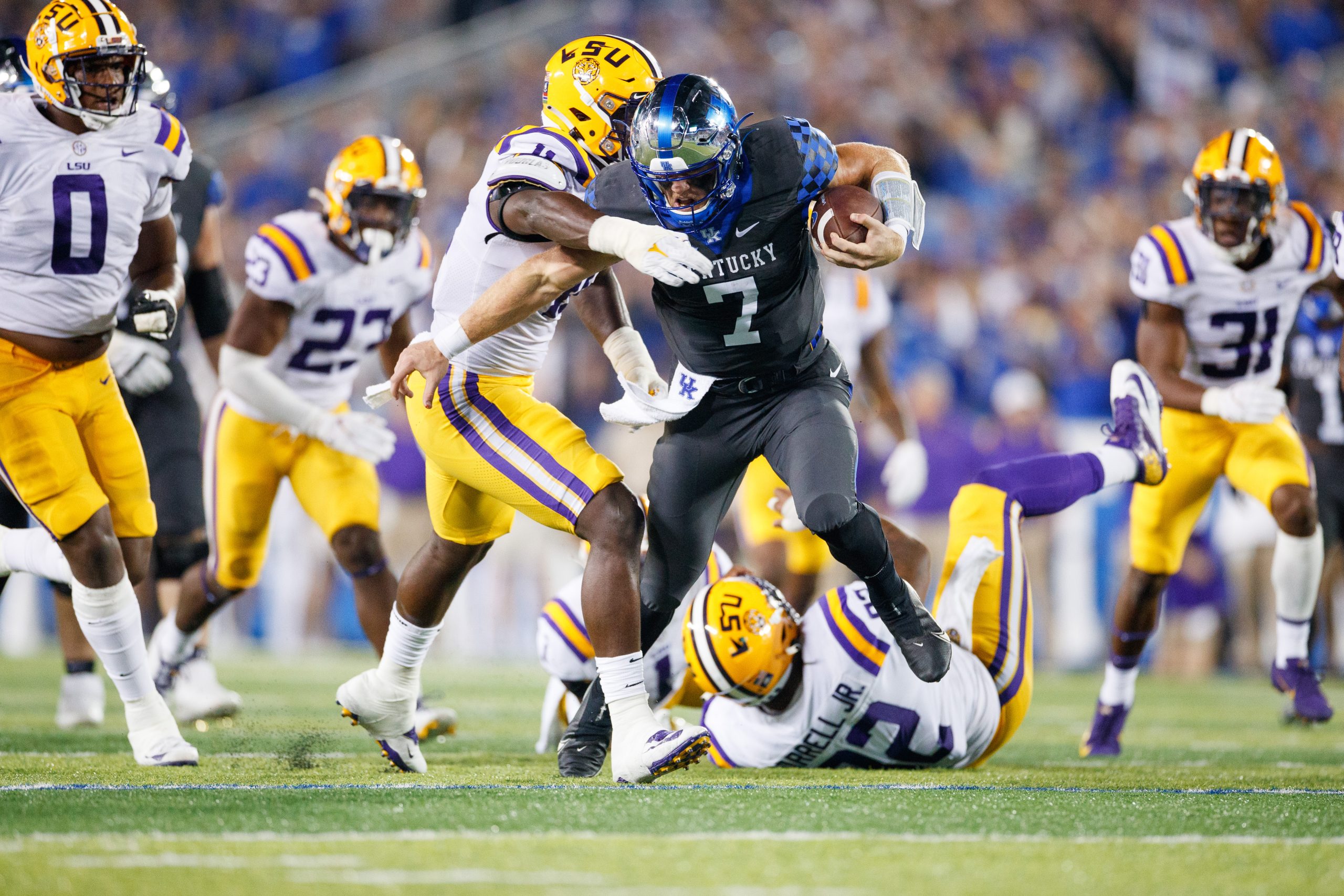 LEXINGTON, Ky. – Two SEC football teams trending in different directions collide here Saturday night at 6:30 CT when struggling LSU faces freshly ranked No. 14 and unbeaten Kentucky in Kroger Field.
