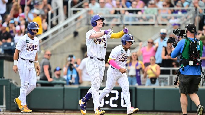 OMAHA, Nebraska – LSU weathered the storm to take a 4-3 lead over UCLA in the bottom of the first inning Monday night and added a run for a 5-3 advantage in the third inning.