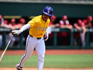 LSU’s offense answered the bell as well with 11 hits to finish with 33 on the weekend and 32 runs. Sophomore outfielder Ashton Larson started as the designated hitter and delivered a three-run home run for a 3-1 lead in the fourth. LSU made it 5-1 in the inning on an RBI single by freshman left fielder Derek Curiel and with another run on a wild pitch.