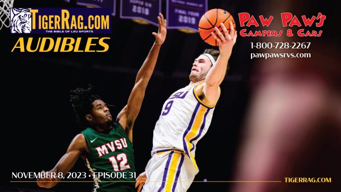 TigerRag.com’s Audibles podcast – Episode 31 – November 8, 2023 – Hosted by Camryn Conner. CC talks with Tiger Rag Assistant Editor William Weathers as the two analyze Kim Mulkey’s team’s surprising upset loss to Colorado in its season-opener at Las Vegas while on the same night back in Baton Rouge 7-footer Will Baker thrilled in his debut as a Tiger by dropping in a career-high 29 points – scoring from everywhere on the court – as LSU dominated Mississippi Valley State, 106-60. Weathers also provides insight on Matt McMahon’s Tigers.