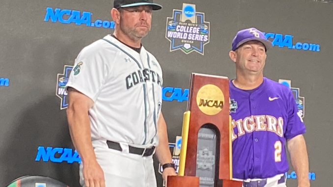 No. 13 seed Coastal Carolina (56-11) and No. 6 seed LSU (51-15) open the best-of-three national championship series at 6 p.m. Saturday on ESPN at Charles Schwab Field. Game two will be at 1:30 p.m. Sunday on ABC with a third game – if necessary – at 6:30 p.m. Monday on ESPN.
